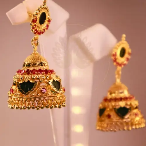 Bridal jewelry definitively requires significantly more elaborate detailing and impressively larger proportions. Specifically, the Heavy Bridal Palakka Jhumka fearlessly features multiple cascading tiers of vividly bright green Palakka stones deeply set in thick, heavy golden brass. Consequently, the sheer volume of these earrings wonderfully frames the face with pure, unadulterated royalty. Indeed, we meticulously engineered them to look unimaginably heavy while remaining surprisingly wearable.