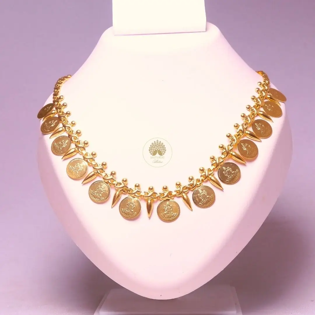 Whether you dress up for a massive family gathering or simply style a classic traditional saree for a temple visit, the Coin Mullamottu necklace provides the absolute missing piece for your jewelry collection. Furthermore, the brilliant gold tones reflect light beautifully. As a result, you will definitely stand out in the most elegant way possible.
