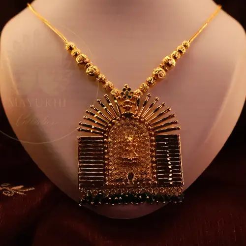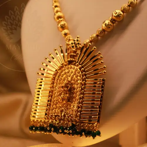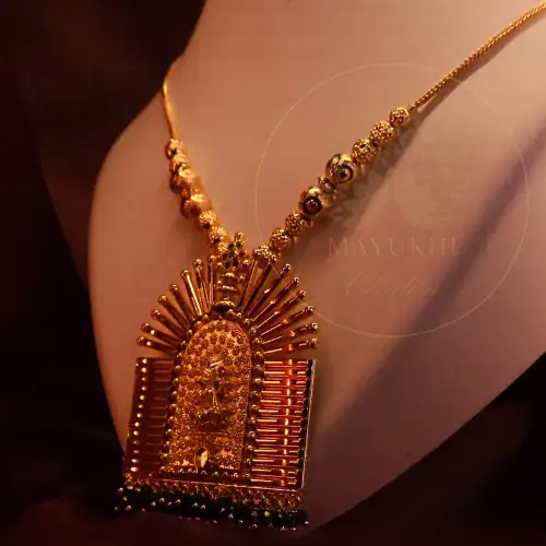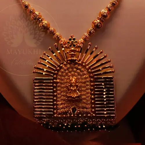 Each Devi Thidambu Necklace undergoes a meticulous multi-step creation process. Skilled artisans first carefully sculpt the deity motif with remarkable precision. Subsequently, they apply a premium gold plating that delivers a rich, lustrous finish designed to endure daily wear. Furthermore, the necklace features a secure clasp mechanism and a comfortable weight distribution that sits perfectly on your neckline.
