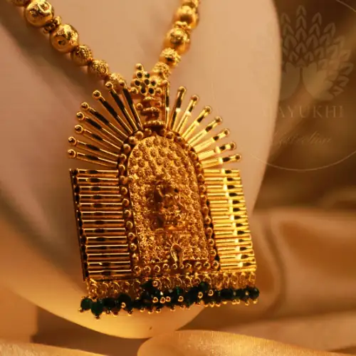 Thidambu Nritham is a magnificent ritualistic art form performed in Kerala temples, where the deity’s golden replica is carried during grand processions. This Devi Thidambu Necklace beautifully captures that divine essence through its intricate deity motifs and rich golden finish. Consequently, wearing this piece is not merely about adornment; it is about carrying a powerful cultural blessing that connects you to your spiritual roots.