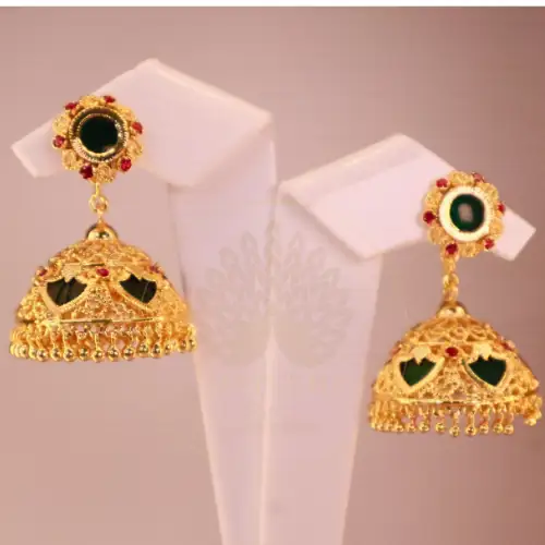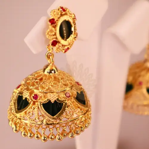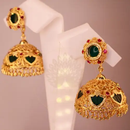 There is a profound reason why Kerala heritage jewelry remains incredibly popular worldwide. Specifically, the Palakka Ruby Jhumka Earrings flawlessly combine vibrant green enamel leaves with striking ruby-red center stones. Consequently, we enthusiastically present these masterpieces to modern women who deeply respect cultural origins. Indeed, wearing these Jhumkas instantly transforms your entire aura.