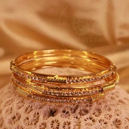 Styling the majestic Vaidurya Bangle is an absolute and delightful joy. For a truly regal and commanding presence in any room, we highly recommend pairing it with a rich traditional Kasavu sari or a vibrant Kanchipuram silk drape. The brilliant golden sheen of the metal will beautifully and naturally enhance the delicate zari work on your luxurious saris. Alternatively, if you personally prefer a much more understated and delicate elegance, you can confidently wear them with a simple elegant kurti or a flowing Anarkali suit. They elegantly and effortlessly bridge the gap between traditional heritage and modern fashion sensibilities.